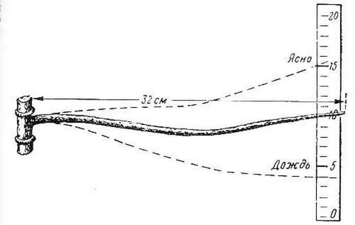 Для производства такового барометра нужен кусочек ствола сухого маленького деревца (длиной 25-30 см) вкупе с веткой длиной 30-35 см. Ствол с веткой очищают от коры и прикрепляют к дощечке, которую вешают на стену. При всем этом ветка должна размещаться так, чтоб при опускании-поднимании свободного конца ветки он передвигался параллельно стене и не задевал ее. Поднятие ветки говорит о ясной погоде, а опускание – к ненастью.