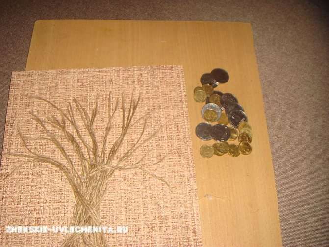 - Красивым выходит также валютное дерево, выполненное как панно (большая картина). В качестве базы употребляется плотный картон, ДВП, холст либо мешковина. Монетки, ствол из проволоки либо толстых вязальных нитей, корешки и другие элементы панно крепятся клеем мгновенного деяния (либо клеевым пистолетом). Древесный ствол можно сделать даже из маленького количества шпаклевки, в какой при застывании процарапывается фактура ствола и веток дерева. В таком случае, шпаклевка и монетки покрываются краской, лучше золотистого цвета.